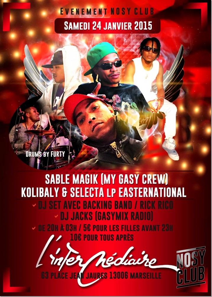 RDV le samedi 24 JANVIER avec SABLE MAGIK,KOLIBALY & Lp EASTERNATIONAL et FURTY,un plateau de jeunes artistes gasy prometteurs accompagné par dj Rick Rico(official NOSY CLUB) et....et...dj Zandry Jacks de Mada Gasy'Mix qui CELEBRERA son 29ème ANNIVERSAIRE(il n aime pas les chiffres ronds) et il nous a promis de renverser la salle.