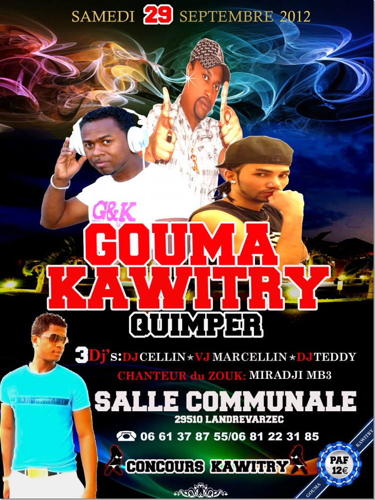 Pour la 1er fois GOUMA KAWITRY débarque en BRETAGNE (quimper) le Samedi 29 septembre 2012 avec 3 meilleurs DJ : VJ MARCELLIN ( Paris); DJ TEDDY ( Référence Kawitry );DJ CELLIN (Bretagne) + 1 CHATEUR du ZOUK MIRADJI MB3 en show case