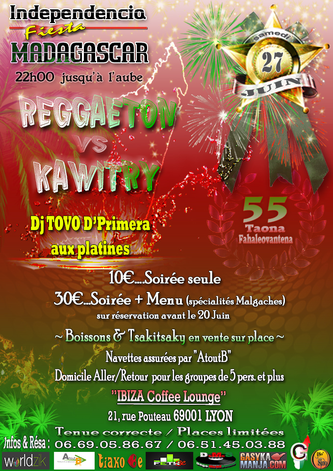 | PAF : | 10€ Soirée seule // 30€ Soirée + Repas spécialités Gasy |