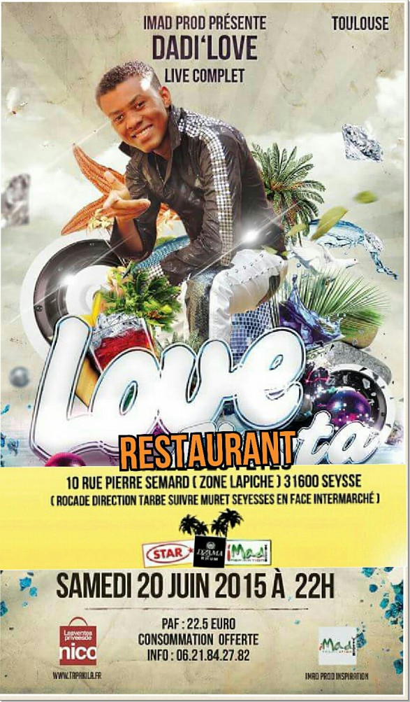 IMADPROD ..Fidèle à sa conception de la musique, vous présente le groupe DADI'LOVE au grand complet, orchestre de 22h à 6h du matin, 100% LIVE. Ambiance festive comme au pays, Boissons Star et tsakitsaky Gasy en vente sur Place. Sono et lumière pro. .