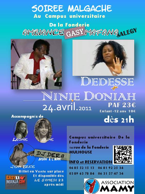 Avec l'Association MAMY, nous aurons le plaisir d'accueillir la chanteuse Ninie Doniah et Le chanteur vedette DEDESSE sur Mulhouse le 24 avril 2011 à 21h00