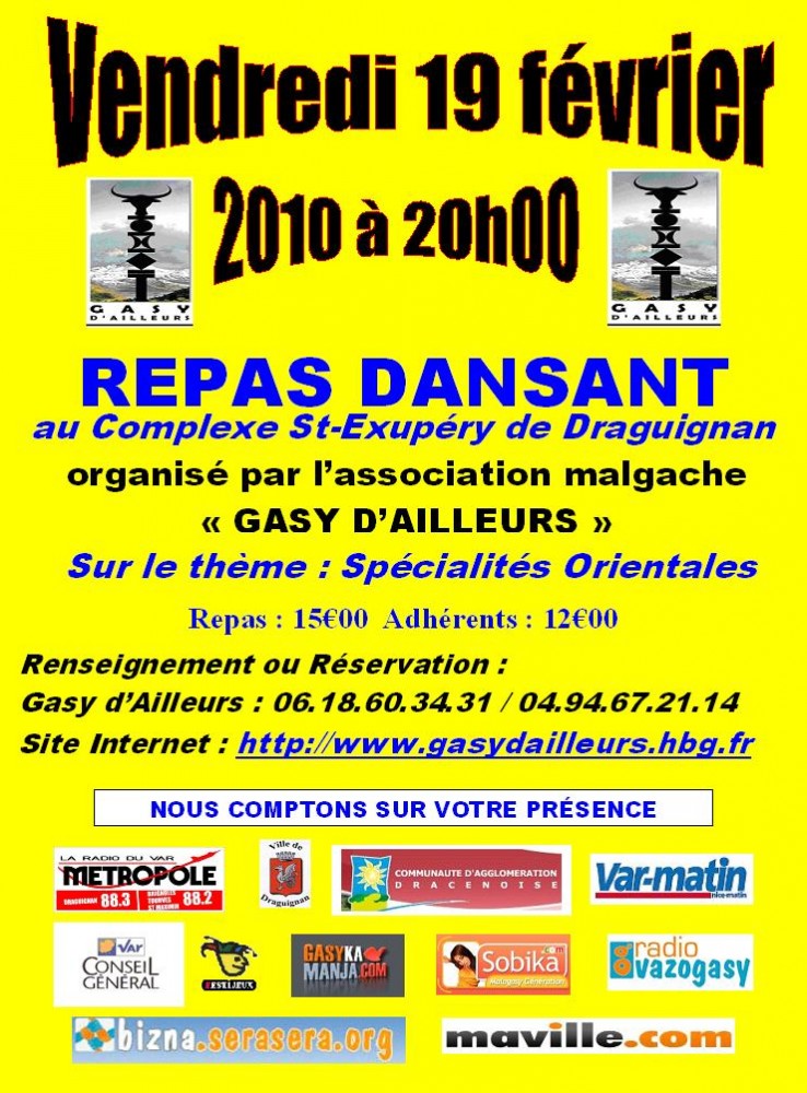 L’association Malgache « Gasy d’Ailleurs » est heureuse de vous accueillir à la salle des fêtes Saint-Exupéry de Draguignan pour un repas dansant sur le thème « Spécialité Orientale » le vendredi 19 février 2009 à partir de 20h00. Ambiance assurée, cette soirée traditionnelle est basée sous le signe de l’amitié, de la convivialité et des découvertes des saveurs du Monde. Un verre de bienvenue vous sera offert.