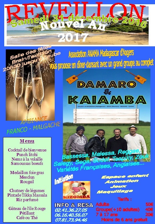 ANAMA Madagascar d'Angers -"Réveillon Tongasoa 2017" , ANIMATION ORCHESTRE AU GRAND COMPLET, 20h30 jusqu'à l'aube. Venez nombreux en famille, entre amis, en couple ou seul pour fêter cette nouvelle année tous ensemble! Dîner-dansant : 50€ adulte - Groupe (+10 adultes) 40€ par personne.