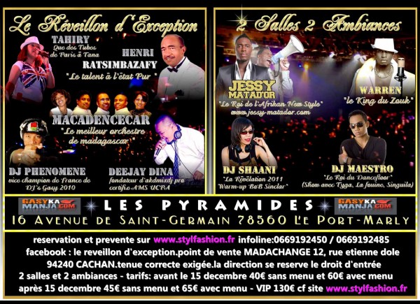 presence de plusieurs artistes internationaux Jessy Matador, Warren zouk et nationaux Henri Ratsimbazafy,Tahiry Ndondolahy,Macadence car , libre accés sur 2 salles et 2 ambiances dans des cadres exceptionnels. Plusieurs dj comme deejay Dina,dj Shaani, dj Phenomene, dJ Maestro.vente des billets sur www.stylfashion.fr ou Madachange Cachan