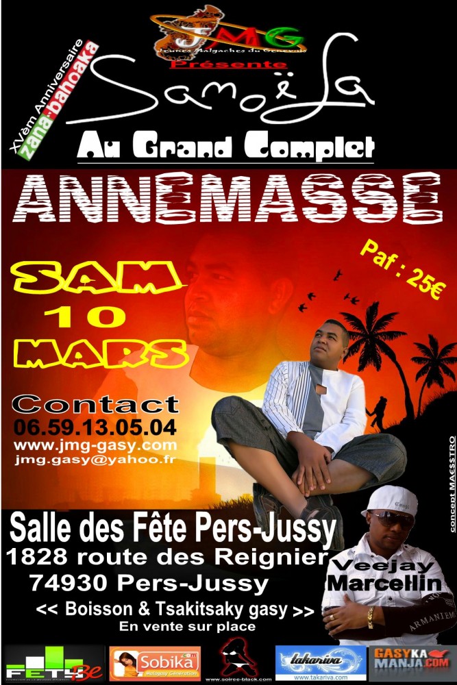 A 21h 00,le Sam 10 Mars 2012,L'enfant terrible des chansons à texte Malgache débarque Dans la région Genevoise, en Haute-Savoie,cette fois ci dans le cadre de la célébretion de ses XV an de scène.La star va se produire au grand complet,un spéctacle avec son nouvel Album Zana-bahoaka.