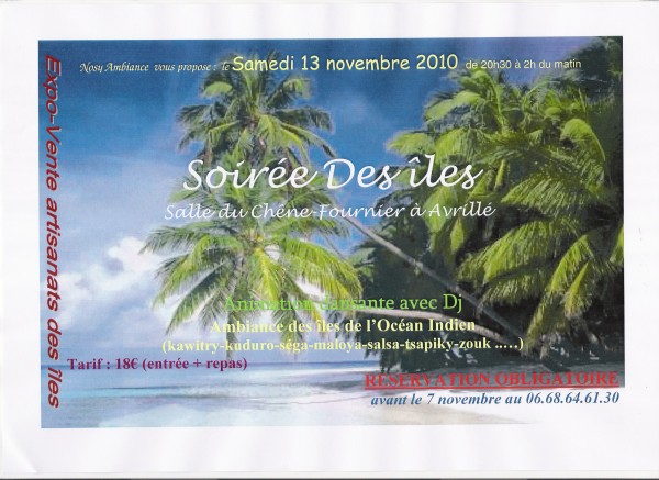 Soirée dansante avec repas. Ambiance des îles de l'Océan Indien (Tsapiky-Séga-Maloya-Zouk-Salegy-Kuduro...) avec animation et demonstration de danses.Ouvert à tous, le tarif est seulement de 18€ adulte et 9€ de 10 à 15 ans.Venez nombreux.Réservation obligatoire au 06.68.64.61.30 avant le 7 novembre.