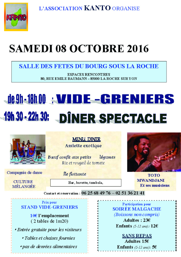 Dîner spectacle et bal avec la compagnie de danse Culture mélangée (danses malgaches, africaines et réunionnaises) et le groupe Toto MWANDJANI (tubes malgaches et d'ailleurs, d'antan et d'aujourd'hui