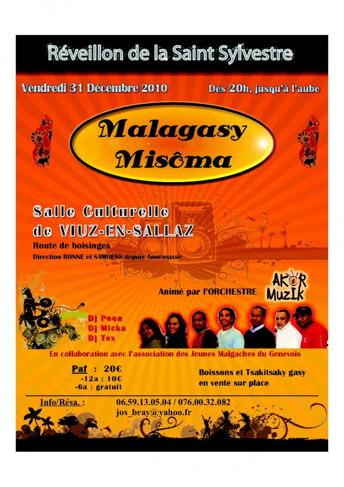 Soirée Malgache de fin d'année 2010 "Malagasy Misôma",de 20h jusqu'à l'aube,qui sera animée par l'orchestre Akor Muzik,DJ Poon,DJ Micka et DJ Tex.Des boissons et sakafo gasy seront en vente sur place avec vary amin'anana à l'aube.